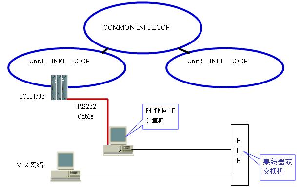 新安装的时钟同步计算机通过ICI接口连接到INFI环中,该计算机再通过网线 连接到MIS/SIS系统网络中,在计算机上运行我公司开发的时钟同步软件使INFI环时间与整个MIS/SIS系统时间一致。